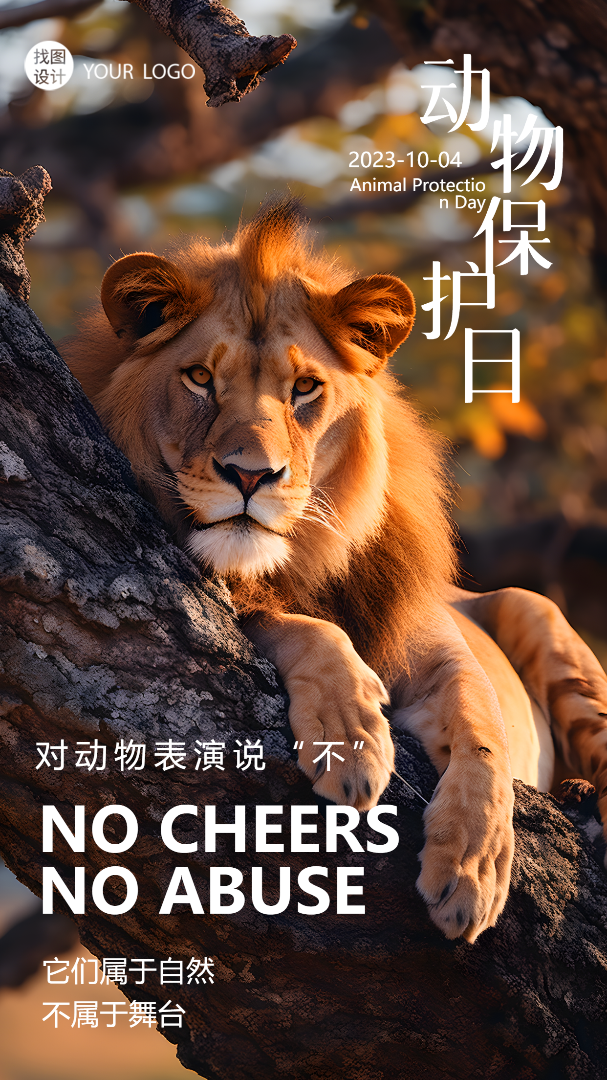 世界动物保护日趴在树上的狮子实景手机海报